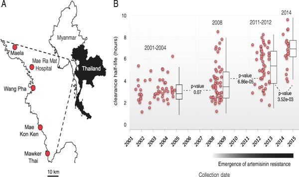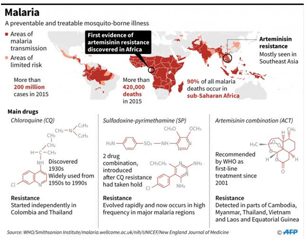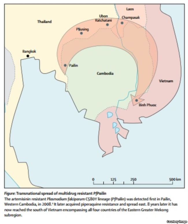 Đột biến C580Y của Plasmodium falciparum kháng với thuốc artemisinin, phát hiện đầu tiên tại Pailin, phía tây Campuchia vào năm 2008, sau đó nó kháng với piperaquine và lan sang phía đông Campuchia, đông bắc Thái Lan, nam Lào, 8 năm sau đã xuất hiện tại phía nam Việt Nam.