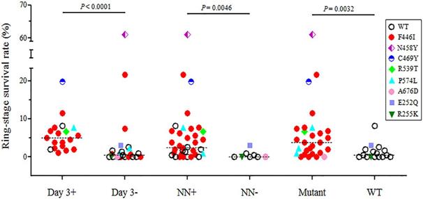 Mối liên quan giữa đột biến K13 với sự làm sạch 50% dung khối ký sinh trùng trên lâm sàng được xác lập và hầu hết bệnh nhân nhiễm P. falciparum có đột biến với K13 alen có thời gian làm 50% dung khối ký sinh trùng là 5 giờ, trong khi thời gian này ở nhóm không có đột biến K13 mà chỉ có đột biến hoang dại, sự khác biệt này có ý nghĩa thống kê (p < 0,001).