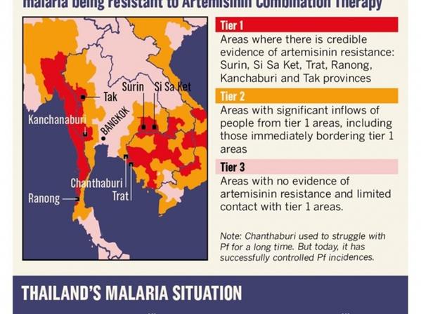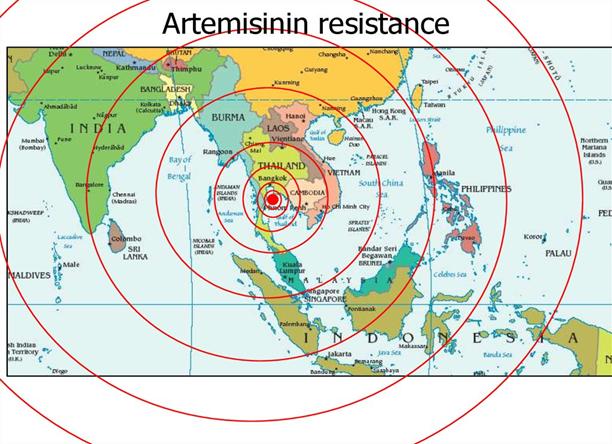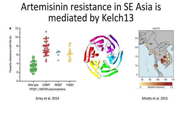 P. falciparum kháng với artemisinin lan rộng và tiếp sau đó là kháng với các thuốc phối hợp hay làm giảm hiệu lực thuốc ACTs tại các quốc gia trong tiểu vùng sông Mê Kông (GMS) là mối đe dọa lớn nhất đến Chính sách kiểm soát và Loại trừ sốt rét trong khu vực và cả phạm vi toàn cầu. Kháng thuốc artemisinin có liên quan đến đột biến gen PfKelch hay thường gọi là gen K13, ban đầu phát hiện nhiều đột biến Kelch độc lập nhưng những tiến triển mới gần đây trên nhiều nghiên cứu đa trung tâm cho thấy một dòng đột biến của chủng P. falciparum là kiểu đột biến C580Y kháng artemisinin chiếm ưu thế, đang nổi lên đã xuất hiện ở phía tây Campuchia, đã vượt ra ngoài nước này với biểu hiện các ký sinh trùng sốt rét kháng thuốc artemisimin và sau đó còn phát triển với kháng thuốc đi kèm (partner drug) loại piperaquine phosphate.