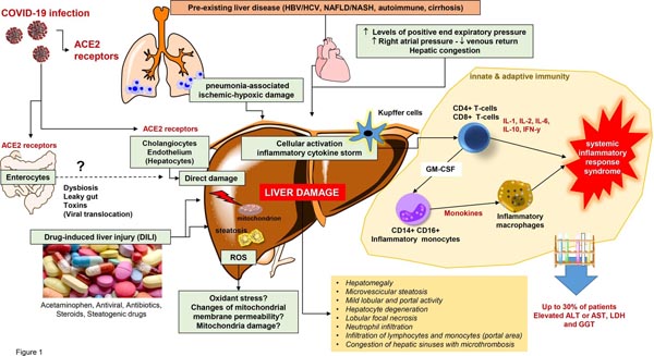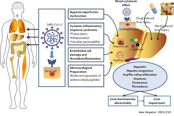 Ngoài ra, các phần tử SARS‐CoV‐2 không có túi liên kết màng đã được phát hiện trong tế bào chất của tế bào gan từ 2 bệnh nhân mắc COVID‐19 với các dấu hiệu tổn thương gan tăng cao. Tuy nhiên, các mẫu này không được đánh giá về sự hiện diện của RNA virus để loại trừ bệnh khác nguồn gốc của các hạt này. Đáng chú ý, virus SARS‐CoV‐2 có thể lây nhiễm sang mô liên quan đến ruột và một số ca COVID‐19 (<15%) biểu hiện virus RNA trong máu của họ. Do đó, người ta cho rằng virus SARS-CoV-2 có thể xâm nhập vào hệ tuần hoàn cổng, đến gan, và các tế bào Kupffer có thể cố gắng loại bỏ virus và tạo ra viêm cục bộ.