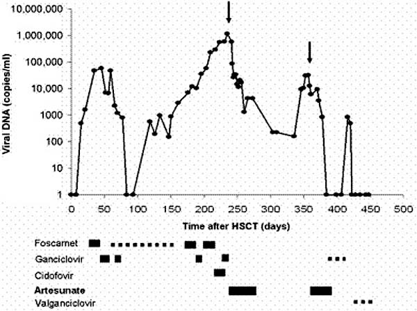 Tại thời điểm này, điều trị với tất cả các thuốckháng CMV thường quy chỉ định đều bị cắt và dùng Artesunate đường uống (100 mg/ngày; được sự chấp nhận của Hội đồng đạo đức nghiên cứu của viện) để điều trị trên cơ sở điều trị đến cùng cho người bệnh. Ghi nhận có một đáp ứng thích hợp, với sự giảm nhanh tải lượng virus và cải thiện sự sinh tuỷ trong vòng 10 ngày sau khi bắt đầu điều trị. Không ghi nhận tác dụng ngoại ý nào trong vòng 30 ngày điều trị. Không có tác dụng dội lại tải lượng virus trong vòng 76 ngày sau khi hoàn tất điều trị.