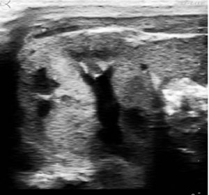 Hình 1: mặt cắt ngang thận phải của một bé sơ sinh đẻ non 34 tuần. Giãn ứ dịch áp lực thấp của một đài thận lớn và hình ảnh phản âm nhẹ ở một nhú thận.