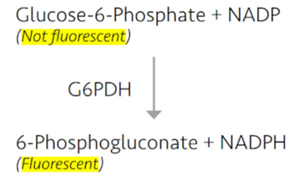 Nếu bệnh nhân thiếu hoạt độ G6PD, phản ứng trên không xảy ra, Glucose-6-Phosphate không phát ánh sáng huỳnh quang, màu sắc tối hơn.