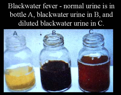 Nước tiểu có huyết cầu tố: lúc đầu nước tiểu đỏ tươi rồi nhanh chóng chuyển sang nâu đen như cà phê, hoặc nước vôi đặc (do oxyhemoglobine chuyển thành methemoglobine). Nước tiểu để lắng lâu hoặc sau ly tâm chia thành 2 lớp: lớp trên là nước tiểu màu đen, lớp cặn dưới nâu sẩm gồm huyết cầu tố, trụ tế bào biểu mô, trụ hạt và trụ trong. Từ ngày thứ 2-3 trở đi, bệnh nhân thường đái ít dần, lúc đầu do mất nước (qua nôn, mồ hôi, sốt, không ăn uống được) gây giảm thể tích máu lưu chuyển, về sau là suy thận thực thể do hoại tử cấp các ống thận. Giữa 2 cơn tán huyết thì nước tiểu bớt nâu đen, nước tiểu nhạt dần và nếu qua được suy thận cấp sẽ có đa niệu với nước tiểu vàng trong. Thời gian đái huyết cầu tố ngắn là vài giờ, trung bình 3-4 ngày, hạn hữu là 7-10 ngày.