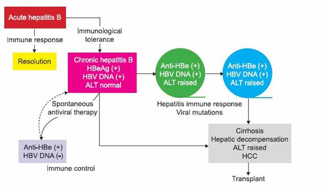 Sau khi HBV nhập vào cơ thể, hệ miễn nhiễm sẽ tạo kháng thể cho từng kháng nguyên của HBV (xem hình). Một tuần hay một tháng sau khi nhiễm siêu vi trùng, HBsAg xuất hiện trong máu, tiếp theo là HBeAg và kháng thể IgM và IgG cho HBcAg (anti-HBc). Khi HBsAg biến mất, thì kháng thể chống sAg (anti-HBs) mới xuất hiện. Một khi anti-HBs xuất hiện người bệnh được coi như hồi phục, trở thành miễn nhiễm đối với HBV và không lây bệnh qua người khác được. Một số bệnh nhân không tạo được kháng thể này và tiếp tục mang mầm bệnh HBsAg, sẽ có thể lây cho người khác. Kháng thể anti-HBc có hai loại: IgM trong thời kỳ bị nhiễm trùng cấp tính và IgG trong thời kỳ chuyển tiếp. Nếu anti-HBc IgG không hạ xuống và có HBsAg có nghĩa bệnh nhân đang bị dạng viên gan mạn tính. Nếu HBeAg dương tính là dấu hiệu cho thấy virus đang nhân lên mạnh mẽ, bệnh nhân có khả năng lây cao, trường hợp này cần điều trị. Khi thử nghiệm thấy anti-HBe thì có tiên lượng tốt hơn và khả năng lây không nhiều. Hiện nay, có xu hướng căn cứ vào định lượng HBV DNA để làm căn cứ điều trị, tuy nhiên điều này chưa được hoàn toàn khẳng định.