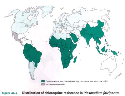 Hiện tượng kháng thuốc đầu tiên được ghi nhận vào cuối những năm 50 của thế kỷ XX tại Thái Lan và Cambodia, sau 12 năm từ khi thuốc này được đưa vào điều trị sốt rét. Đến năm 1980, kháng chloroquine đã lan rộng đến hầu như các khu vực có sốt rét ở Nam Mỹ và cả khu vực châu Á, châu Đại Dương vào năm 1989. Ở châu Phi, kháng chloroquine ban đầu xảy ra vào năm 1978 tại miền đông, sau đó lan rộng về phía tây trong những năm sau đó. Ngày nay, hiện tượng P.falciparum kháng với chloroquine được ghi nhận ở hầu như tại các vùng sốt rét lưu hành ngoại trừ khu vực Trung Mỹ (33) và những nghiên cứu gần đây cho thấy phạm vi kháng thuốc đã dịch chuyển từ châu Á sang châu Phi (34, 35). Trong 50 năm qua, kháng chloroquine chỉ xảy ra cục bộ với cường độ thấp hơn 10 lần (hình A6.4)