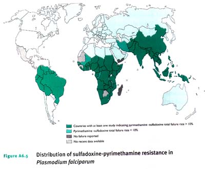 Hiện nay, đã có nhiều nơi xảy ra hiện tượng kháng cao với tỷ lệ thất bại điều trị lớn ở trẻ em. Những bằng chứng về sinh học phân tử gần đây cho thấy loài KSTSR P.falciparum kháng thuốc có nguồn gốc tại Đông-Nam Á đã có mặt tại hầu hết các nước Đông và Trung Phi (dạng đột biến gen dhfr thứ 3) (9,40-42) (hình A6.5).
