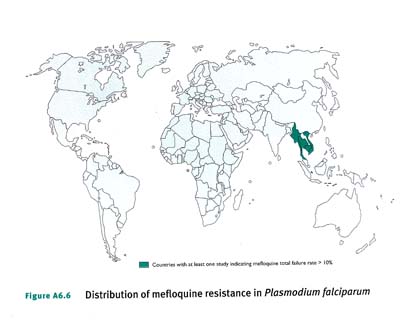 Hiện tượng kháng với thuốc này lần đầu tiên được báo cáo tại các biên giới Thái Lan-Cambodia và Thái Lan-Miến Điện vào cuối những năm 1980 (43,44) trong bối cảnh các phác đồ điều trị sốt rét đơn thuần đã trở nên không còn hiệu lực nữa. Những thợ mỏ đá quý trở về từ Cambodia có thể đã giúp lan truyền kháng mefloquine tới tận Ấn Độ và Bangladesh (45). Những ca sốt rétkháng mefloquine rải rác cũng được phát hiện tại lưu vực sông Amazon và các thử nghiệm in vitro ở châu Phi đã xác định một số chủng P.falciparum có độ nhạy thấp với mefloquine. Nhìn chung, hiện tượng kháng lâm sàng với mefloquine bên ngoài khu vực Đông-Nam Á hiếm gặp (hình A6.6).