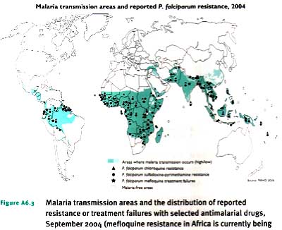 Trên thế giới, hiện tượng kháng lan rộng của ký sinh trùng sốt rét P.falciparum với chloroquine, sulfadoxine-pyrimethamine và mefloquine trong những năm gần đây đã trở thành vấn đề đặc biệt nghiêm trọng đối với các chương trình quốc gia phòng chống sốt rét (hình A6.3). Ở một số nơi P.vivax cũng đã phát triển kháng với antifolate và chloroquine và P.malariae cũng được ghi nhận đã kháng với chloroquine. Tuy nhiên, chưa có báo cáo đầy đủ nào cho thấy ký sinh trùng sốt rét (KSTSR) đã kháng với artemisinin và các dẫn chất, dù việc điều trị loại thuốc chống sốt rét này được áp dụng rộng rãi ở nhiều nước của châu Á..