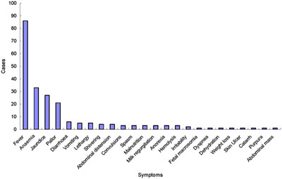 Trong số 104 trường hợp mắc bệnh SRBS, có 96 trường hợp báo cáo triệu chứng lâm sàng (Hình 2), trong đó có 86 trường hợp (89,58%) được mô tả có sốt. Trong nhóm có sốt này thì có 78 trường hợp bị sốt với các biểu hiện điển hình, chỉ có 27 trường hợp mô tả sốt không liên tục. Các biểu hiện lâm sàng khác như thiếu máu (33 trường hợp chiếm 34,38%), vàng da (27 trường hợp chiếm 28,13%), cơ thể da nhợt nhạt (21 trường hợp chiếm 21.88%), tiêu chảy (6 trường hợp chiếm 6,25%), nôn (5 trường hợp chiếm 5,21%), suy nhược và không hoạt động (5 trường hợp chiếm 5,21%), rét run (4 trường hợp chiếm 4,17%) và trướng bụng (4 trường hợp chiếm 4,17%).