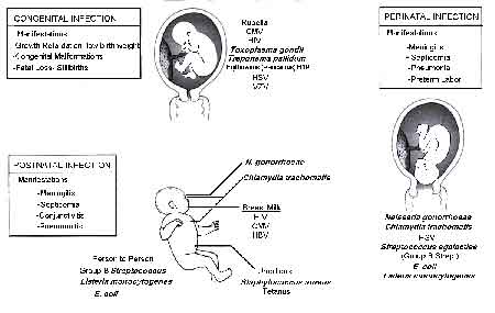 Cả sốt rét sơ sinh và sốt rét chu sinh (congenital and perinatal malaria) đều mắc phải do ký sinh trùng đi qua nhau thai. Một đứa trẻ được mô tả có sốt rét bẩm sinh khi tiền sử mẹ của chúng mắc sốt rét vào thời điểm tháng thứ 6 của thai kỳ (!), đứa trẻ ấy thường sốt từng cơn trong 5 tuần tuổi, có kèm thiếu máu và gan lách to ở lúc 3 tháng tuổi và cũng là lúc phát hiện được ký sinh trùng sốt rét Plasmodium falciparum trong lam giọt đặc của máu đứa bé. Các kháng thể kháng sốt rét loại IgG và IgM được phát hiện trong máu người mẹ lúc sinh và cũng là thời điểm chẩn đoán xác định. Các kháng thể này truyền qua nhau thai có thể giúp cơ thể đứa bé bảo vệ một cách tạm thời, vì thế khiến cho quá trình phát hiện và chẩn đoán muộn hơn. Do đặc điểm truyền quan nhau thai, nên thiếu đi chu kỳ ngoài hồng cầu (exoerythrocytic cycle) trong trường hợp sốt rét bẩm sinh.