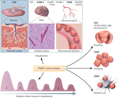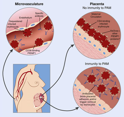 P. falciparum là ký sinh trùng duy nhất có khả năng kết dính tế bào và phân tử như CD36 và phân tử 1 kết dính nội bào có liên quan đến sự hình thành sốt rét ác tính ở trẻ sơ sinh và những phụ nữ không mang thai. Chondroitin sulfate A và hyaluronic acid có vai trò như các phân tử kết dính của ký sinh trùng sốt rét dính vào tế bào nhau thai. Các cầu nối được coi là sự liên hệ giữa ký sinh trùng PfCSA-L với nhau mang tính kháng nguyên trong số những ca sốt rét PNMT trên phạm vi toàn cầu, điều này cho thấy duy nhất quần thể phụ của P. falciparum không gắn kết với CD36 được. Sự ẩn cư của ký sinh trùng dọc theo bề mặt màng bánh nhau, đặc biệt các vi mao tại trophoblastic,extravillous trophoblasts và cầu nối hợp bào. Các khoảng giữa vi nhung mao chứa đầy ký sinh trùng và đại thực bào, nên sẽ ngăn cản vi chất dinh dưỡng và oxy vận chuyển qua phôi thai một cách đầy đủ như những bà mẹ mang thai không bị sốt rét. Các vi nhung mao phì đại và hoại tử, gây fibrin hóa (hoàn toàn hoặc bán phần) cũng đã được tìm thấy. Tất cả mô nhau thau đều xuất hiện các hạt pigment sốt rét (thậm chí có hoặc không có ký sinh trùng). Tất cả sự thay đổi này làm cản trở quá trình vận chuyển vi chất và oxy, có thể gây xuất huyết toàn thân, dẫn đến nhiều biến chứng ở trẻ và tính mạng bà mẹ.