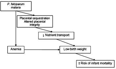Mục đích của dự phòng theo IPT là làm giảm hoặc loại trừ các tác dụng có hại của sốt rét lên tình trạng thiếu máu ở người mẹ và giảm sút cân ở con; ngoài ra, ở vùng lan truyền thấp thì nên ngăn ngừa sốt rét ác tính cho bà mẹ. Bệnh sốt rét gây chậm phát triển trong tử cung như thế nào đến nay vẫn chưa thấu đáo, nhưng trong sốt rét do P. falciparum, thì sự chậm phát triển này có xu hướng xảy ra nhất trên những phụ nữ mang thai lần đầu. Lượng ký sinh trùng sốt rét trong nhau càng lớn thì trọng lượngthai nhi sinh ra càng nhỏ. Sốt rét bẩm sinh-một bằng chứng liên đới đến sự kết cụm các hồng cầu bị ký sinh dẫn đến chấm dứt thai kỳ do tử vong, đã làm gián đoạn một số nghiên cứu can thiệp, mặc dù mối liên quan giữa sốt rét bẩm sinh và giảm trọng lượng trẻ sinh ra cũng chưa được xác lập rõ ràng.