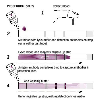 5.Đưa một bộ chẩn đoán và điều trị sốt rét (malaria kit_MK) và đào tạo cho các đối tượng nguy cơ. Kit này đưa đến trong những trường hợp cấp cứu để xử lý cho những trường hợp nghi do sốt rét mà thời gian chuyển viện quá dài và cách xa đơn vị y tế. Kit bao gồm: miếng dán đo thân nhiệt tại trán của người bệnh (forehead temperature strips), Test chẩn đoán nhanh đối với sốt rét do loài P.falciparum (Paracheck P.f, Core Malaria Pf) và thuốc sốt rét (loại thuốc chóng sót rét tùy thuộc vào danh mục và chiến lược dùng thuốc sốt rét của từng quốc gia). Nếu kết quả tự thử test dương tính thì chúng ta có thể bắt đầu dùng thuốc điều trị sốt rét và trong thời gian đó cần thiết phải liên lạc và tìm kiếm sự trợ giúp của các đơn vi y tế. Nếu kết quả tự thử test âm tính nên làm test lại sau 6-12 giờ.