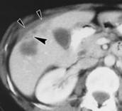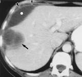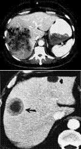 Một phụ nữ 47 tuổi đến viện sau khi đã qua 2 cơn đau bụng phía bên phải. Bà ta không có tiền sử sốt, không có gan lớn qua thăm khám thực thể. Bà ta không bị sốt, không có gan lớn sau khi thăm khám lâm sàng. Các dữ liệu xét nghiệm về sinh hóa, huyết học và tế bào đều cho kết quả bình thường, ngoại trừ có tăng bạch cầu eosin lên đến 11%. Chụp CT scan cho thấy các hình ảnh giảm âm nhiều ổ trên khắp bề mặt gan của bệnh nhân. Một hình ảnh abcès hoại tử nằm ở vùng trước của gan phải, góc và có hình ảnh các nốt giảm âm. Các tổn thương có hình ảnh dạng nốt hoại tử, bờ vằn vèo như xoắn, cả ở vị trí dưới bao gan và nghi ngờ là sán lá gan lớn. Tiến hành chọc sinh thiết bằng kim nhỏ nhằm nghiên cứu về góc độ tế bào kết quả cho thấy hình ảnh hoịa tử xuất huyết và thâm nhiễm các tế bào viêm lymphocyte và tăng số bạch cầu đáng kể, một trong số chúng là các bạch cầu ái toan. Chọc lấy dịch một phần từ ổ dịch dưới bao gan cho thấy hình ảnh dịch màu vàng đục không kèm theo máu. Phân tích tế bào học thì đây là các tế bào viêm của tổn thương nhu mô gan. Nuôi cấy dịch này không thấy xuất hiện tác nhân gây bệnh. Khi đặt ra vấn đề như vậy, hỏi đến tiền sử bệnh cho biết bà ta cũng thuowngf ăn rau cải xoong, tiến hành làm huyết thanh chẩn đoán dương tính Fasciola hepatica với hiệu giá 1/12.560. | Hình ảnh tổn thương gan do sán lá gan lớn trên phụ nữ 47 tuổi, hình ảnh chụp CT scan cho thấy khối abces ngoại biên dưới bao gan (mũi tên), vong bao gan biến dạng. Khối abces nằm ở góc sát với tổn thương gan, dày lên ở vùng bao. |