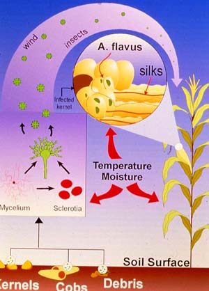Riêng loài nấm Aspergillus flavus thì điều kiện thích hợ có hơi khác. Phân bố dịch tễ học mầm bệnh nấm mốc này khác nhau tùy thuộc vào loài vật chủ. Hình ảnh dưới đây cho thấy chu kỳ của nấm trên ngô vàng. Các loài nấm sống qua mùa đông thường hoặc là hệ sợi nấm hoặc là có cấu trúc kháng như hạch nấm (sclerotia). Hạch nấm hoặc là sinh thêm các bào tử sợi nấm (hyphae) hoặc sinh ra bào tử đính (conidia) hay bào tử thể vô tính, chính điều này sẽ phát tán ra ngoài môi trường, ra đất và không khí. Các bào tử mang đến các cây ngô nhờ côn trùng hoặc nhờ gió, rồi từ đó nhiễm nấm trên ngô và gây hại. Không giống như các nấm khác, loài nấm Aspergillus flavus lại ưa sống trong điều kiện nhiệt độ khô. Nhiệt độ tố ưu để phát triển là 370C (98.6 F), nhưng nấm phát triển nhanh chóng ở khoảng giữa nhiệt độ là 25-420C (77-108 F), và sẽ phát triển ở nhiệt độ 12-480C (54-118 F). Nhiệt độ cao như thế sẽ góp phần vào tăng tính sinh bệnh với con người.