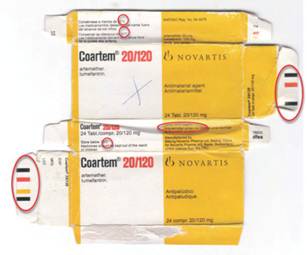Ít nhất 4 mẻ thuốc được xác định (NOF 2153, F2929 và F2261) mang logo màu xanh lá cây của chương trình sốt rét Affordable Medicines Facility, tài trợ kinh phí bởi Global Fund. Số lượng các mẻ thuốc giả đều có thể xác định và tìm thấy mẫu tại trung tâm cảnh báo của TCYTTG.