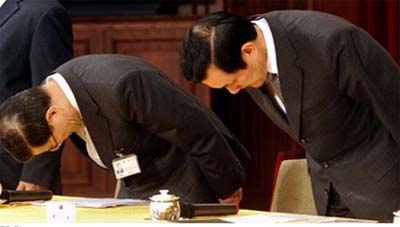 Các lãnh đạo Đài Loan gập đầu xin lỗi dân chúng. (Ảnh: Feer) |