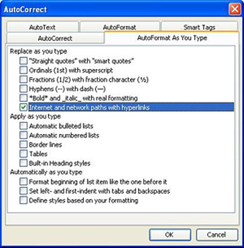 Thẻ AutoFormat và AutoFormat As You Type (trong trình đơn Tools.AutoCorrect Options) là những tính năng xuất sắc mà bạn cần khai thác. Tuy nhiên, 2 thẻ trên cũng cấp vài thông số (thiết lập) hết sức ngớ ngẩn, điển hình là tuỳ chọn Internet and network paths with hyperlinks. Bạn có thể mở trình đơn AutoCorrects Options trong Word để tuỳ biến chúng. |