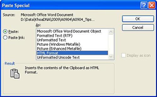 Lệnh dán (Paste) nếu được khai thác đúng mức có thể mang lại cho người dùng Word nhiều lợi ích. Nếu được, hãy hướng dẫn người dùng sử dụng tính năng Paste Special thay vì Paste như thông thường, bằng cách này người dùng có được nhiều tùy chọn hơn khi muốn dán nội dung vào tài liệu. Nhiều người dùng thường sử dụng tùy chọn Unformatted Text khi dán nội dung từ Web hay chép danh sách được đánh số từ tài liệu Word khác.