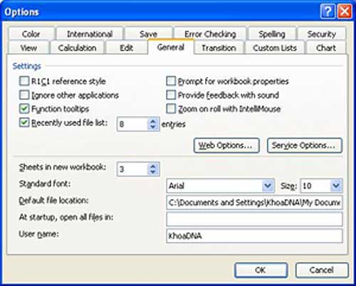 Mọi bảng tính Excel được tạo mới về cơ bản sẽ gồm 3 bảng tính thành phần (sheet) mà chẳng cần quan tâm người dùng có thực sự sử dụng hết chúng không - cũng có trường hợp bấy nhiêu sheet vẫn không đủ. Đừng bận tâm, bạn có thể thay đổi số lượng sheet mặc định trong một bảng tính: chọn Tools.Options, ở thẻ General, bạn đặt một giá trị mới cho mục Sheets in new workbook.