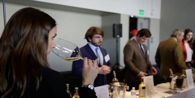 Một phụ nữ nếm rượu vang cổ điển năm 2015 từ Barsac Sauternes trong lễ hội Union des Grand Crus