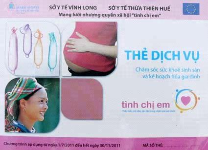 Riêng hai tỉnh Thừa Thiên Huế, Vĩnh Long; có 60 trạm y tế và phòng khám bệnh tư nhân xây dựng mạng lưới nhượng quyền xã hội “Tình chị em” với tiêu đề “thấu hiểu, kín đáo, tận tâm trong chăm sóc sức khỏe” bằng nội dung hoạt động cấp thẻ dịch vụ chăm sóc sức khỏe sinh sản và kế hoạch hóa gia đình. Thẻ dịch vụ này được các Đại sứ thương hiệu phát cho chị em phụ nữ trong độ tuổi sinh sản từ 15 đến 49 tuổi tại các xã thuộc tỉnh có tham gia dự án do Liên minh châu Âu (EU) tài trợ. Phụ nữ tiếp nhận được thẻ dịch vụ sẽ xuất trình thẻ cho cán bộ y tế khi đến nhận dịch vụ tại các cơ sở “Tình chị em” ở 60 cơ sở y tế của hai tỉnh để được hưởng nội dung chăm sóc theo chương trình những dịch vụ đã ghi trên thẻ với giá trị sử dụng theo thời gian quy định từ ngày 01/7/2011 đến hết ngày 30/11/2011.