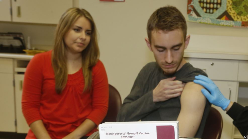 Leslie Meigs nhìn người em trai là Andrew (18 tuổi), sinh viên đại học Texas nhận một loại vắc xin viêm màng não nhóm B (Bexsero) được FDA chấp thuận cho lứa tuổi 10-25, ngày 24/2/2015