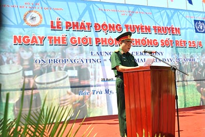 Đại tá TS. Ngọc Anh - Đại diện Cục Quân y (Bộ Quốc phòng) phát biểu về vai trò kết hợp quân dân y trong phòng chống sốt rét Tại Lễ phát động Ngày thế giới phòng chống sốt rét 25/4/2012 tại huyện Bắc Trà My, tỉnh Quảng Nam. |