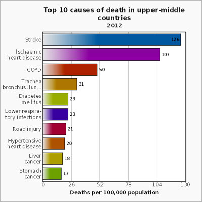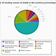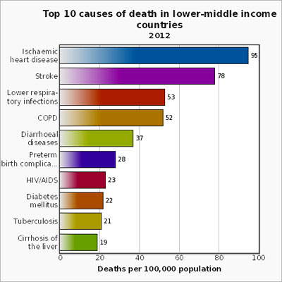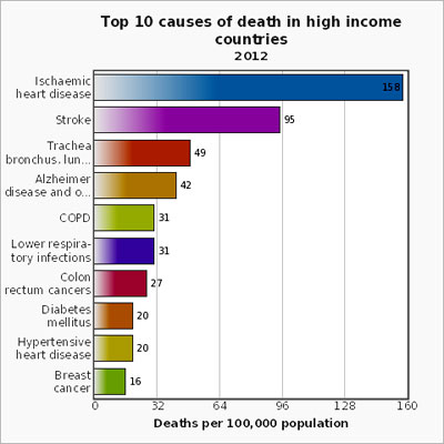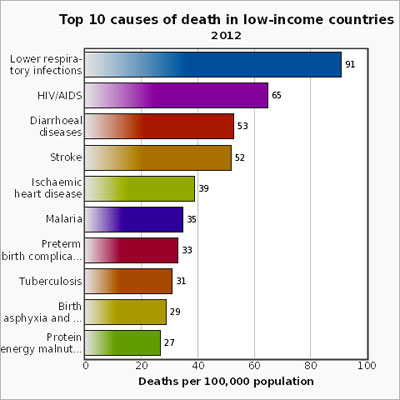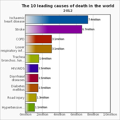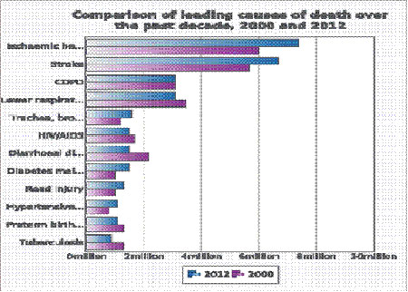 WHO cho biếtbệnh tim do thiếu máu cục bộ, đột quỵ, nhiễm trùng đường hô hấp dưới và bệnh phổi tắc nghẽn mãn tính vẫn còn là những nguyên nhân chính gây tử vong hàng đầu trong thập kỷ qua.Các trường hợp tử vong do HIV/AIDSđã giảm nhẹ từ 1,7 triệu (3,2%) trường hợp tử vong trong năm 2000 xuống còn 1,5trường hợp (2,7%) trong năm 2012. Bệnh tiêu chảy không còn nằm trong top 5 nguyên nhân hàng đầu gây tử vong trên thế giới, nhưng vẫn là một trong top 10 nguyên nhân hàng đầu gây chết 1,5 triệu người trong năm 2012. Các trường hợp tử vong do bệnh mãn tính ngày càng gia tăng trên toàn thế giới. Các trường hợp tử vong do ung thư phổi (gồm ung thư khí quản và phế quản) đã gia tăng từ 1,2 triệu (2,2%) trường hợp năm 2000 lên 1,6 triệu (2,9%) tử vong trong năm 2012. Tương tự như vậy, số trường hợp tử vong do bệnh tiểu đường cũng đã gia tăng từ 1 triệu trường hợp (2,0%) vào năm 2000 lên 1,5 triệu trường hợp (2,7%) trong năm 2012.