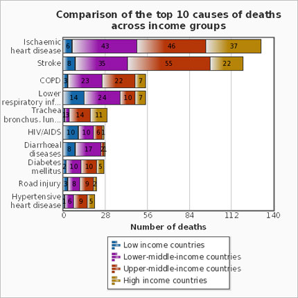 Ở các quốc gia có thu nhập cao, trong 10 trường hợp tử vong thì có 7 trường hợp là những người từ 70 tuổi trở lên. Số người chết chủ yếu là do bị mắc các bệnh mãn tính gồm bệnh tim mạch, ung thư, mất trí nhớ, bệnh phổi tắc nghẽn mãn tính hoặc bệnh tiểu đường. Nhiễm trùng đường hô hấp dưới vẫn còn là nguyên nhân lây nhiễm hàng đầu gây ra các ca tử vong. Chỉ có 1 trong số 100 trường hợp tử vong là trẻ em dưới 15 tuổi . Ở các nước có thu nhập thấp, gần 4 trong 10 trường hợp tử vong là trẻ em dưới 15 tuổi, và chỉ có 2 trong 10 trường hợp tử vong là những người từ 70 tuổi trở lên. Những người chết chủ yếu là do mắc các bệnh truyền nhiễm gồm bệnh nhiễm trùng đường hô hấp dưới, nhiễm HIV/AIDS, các bệnh tiêu chảy, sốt rét và bệnh lao - chiếm gần 1/3 tất cả các trường hợp tử vong xảy ra ở các nước này. Các biến chứng do sinh non, ngạt sinh và chấn thương khi sinh là một trong những nguyên nhân gây tử vong hàng đầu, cướp đi mạng sống của nhiều trẻ em và trẻ sơ sinh.