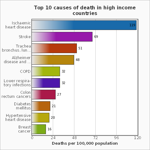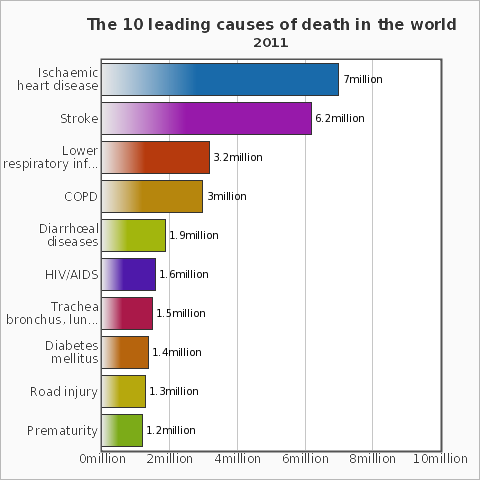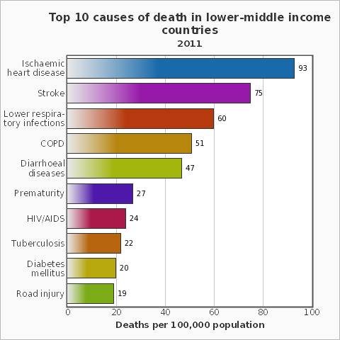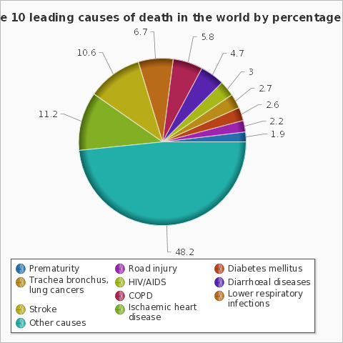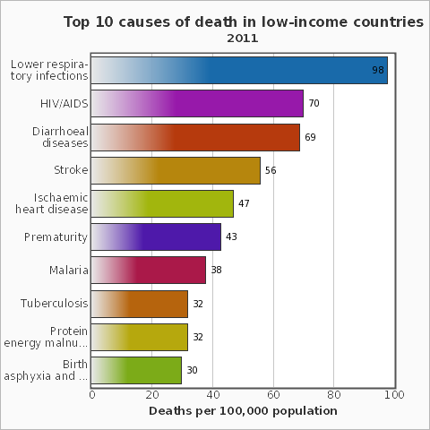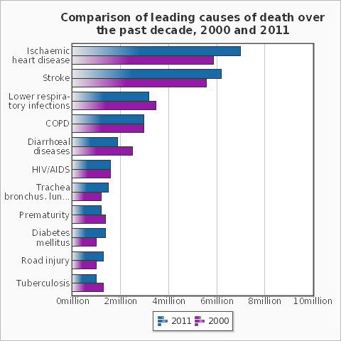 Theo Tổ chức Y tế thế giới (WHO) bệnh tim do thiếu máu cục bộ, đột quỵ, nhiễm trùng đường hô hấp dưới, bệnh phổi tắc nghẽn mạn tính, bệnh tiêu chảy và HIV/AIDS vẫn còn là nguyên nhân chính hàng đầu gây tử vong trong thập kỷ qua.