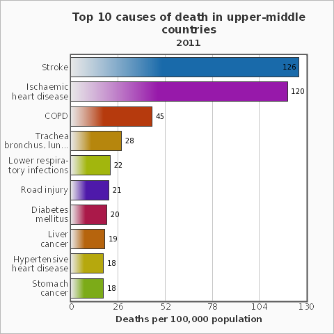 Bệnh lao không còn nằm trong số 10 nguyên nhân tử vong hàng đầu, nhưng vẫn là một trong “top 15 căn bệnh nguy hiểm, giết chết 1 triệu người trong năm 2011 trên phạm vi toàn cầu. Bệnh mạn tính làm gia tăng số trường hợp tử vong trên toàn thế giới. Ung thư phổi (cùng với bệnh ung thư khí quản và phế quản) gia tăng từ 1,2 triệu (2,2%) ca tử vong (vào năm 2000) lên đến 1,5 triệu (2,7%) ca tử vong (năm 2011). Tương tự, bệnh tiểu đường tăng từ 1 triệu (1,9%) ca tử vong (năm 2000) lên đến 1,4 triệu (2,6%) ca tử vong (năm 2011),….