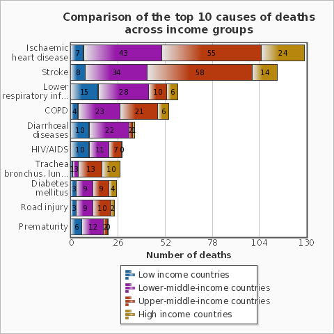 Ở các nước có thu nhập cao, 7 trong 10 trường hợp tử vong là những người từ 70 tuổi trở lên. Số người chết chủ yếu là do bị bệnh mãn tính gồm bệnh tim mạch, ung thư, mất trí nhớ, bệnh phổi tắc nghẽn mãn tính hoặc bệnh tiểu đường. Nhiễm trùng đường hô hấp dưới vẫn còn là nguyên nhân lây nhiễm hàng đầu của các ca tử vong. Chỉ có 1 trong số 100 trường hợp tử vong là trẻ em dưới 15 tuổi. Ở các nước có thu nhập thấp, gần 4 trong 10 trường hợp tử vong là trẻ em dưới 15 tuổi, và chỉ có 2 trong 10 trường hợp tử vong là những người từ 70 tuổi trở lên. Những người chết chủ yếu là vì các bệnh truyền nhiễm gồm bệnh nhiễm trùng đường hô hấp dưới, nhiễm HIV/AIDS, các bệnh tiêu chảy, sốt rét và bệnh lao - chiếm gần 1/3 tất cả các ca tử vong xảy ra ở các nước này. Các biến chứng do sinh non, và ngạt sinh và chấn thương khi sinh là một trong những nguyên nhân tử vong hàng đầu, cướp đi mạng sống của nhiều trẻ em.