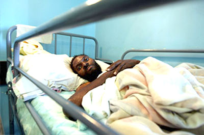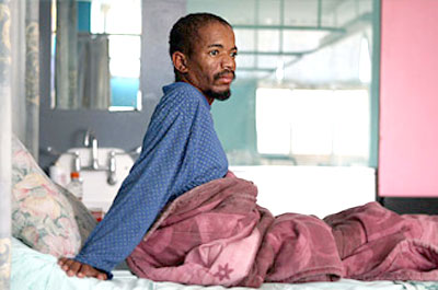 | Một bệnh nhân bị bệnh giai đoạn cuốigiơ cánh tay của mình trong một nhà tế bần cho những người chết vì AIDS tại chùa Phật giáo Wat Prabat Nampu, tỉnh Lopburi, Bangkok. |