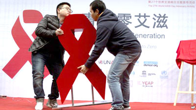 | Các thanh niên di chuyển một dải băng đỏ tại sự kiện nâng cao nhận thức về xét nghiệm HIV nhân ngày Thế giới phòng chống AIDS 1/12, tại Bắc Kinh, Trung Quốc, 27 /11/2014 |