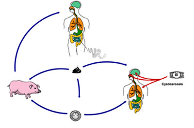Hàng triệu trứng sán dây được thải vào môi trường qua phân của người bị nhiễm bệnh, khi lợn ăn những trứng này hoặc trứng từ môi trường thì các nang nhỏ phát triểnkhắp cơ thể của động vật. Con người bị nhiễm bệnh bằng cách tiêu thụ thực phẩm như thịt lợn sống hoặc nấu chưa chín, hoặc uống nước bị nhiễm trứng sán dây hoặc thông qua thực hành vệ sinh kém.