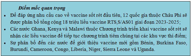 Mười hai quốc gia thuộc các khu vực khác nhau ở châu Phi sẽ nhận 18 triệu liều vaccine sốt rét đầu tiên trong hai năm tới. Việc triển khai dùng vaccine sốt rét là một bước tiến quan trọng trong cuộc chiến chống lại một trong những căn bệnh gây tử vong hàng đầu tại châu lục này.