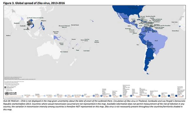 Theo báo cáo mới nhất của WHO đến 18/8/2016, ngoài 67 quốc gia (từ 2013-2015) thì 70 quốc gia và vùng lãnh thổ trên thế giới ghi nhận bằng chứng virus zika do muỗi truyền (từ năm 2007). Trong đó, 11 quốc gia ghi nhận lây truyền qua đường tình dục và 20 quốc gia ghi nhận chứng đầu nhỏ và một số dị tật về thần kinh khác (Guillain-Barré_GBS) liên quan đến virus Zika của người mẹ trong thời kỳ mang thai. Theo hãng tin CNN ngày 30/8/2016, Zika đang tiếp tục lan rộng toàn cầu (Zika continues its march around the world) từ châu Phi tới Polynesia thuộc Pháp đến Trung và Nam Mỹ, hiện nay căn bệnh này đang hoành hành tại Hoa Kỳ (US) và châu Á, đặc biệt là các nước Đông Nam Á trong đó có Việt Nam và có khả năng sẽ tiếp tục lây lan.
