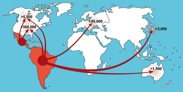 Bản đồ phân bố và lan rộng bệnh Chagas trên thế giới (Nguồn: Nature) |