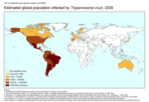 Theo Tổ chức y tế châu Mỹ ước tính có hơn 14.000 ca mang mầm bệnh Chagas khi mới các bé mới chào đời ở các quốc gia thuộc châu Mỹ Latinh và khoảng 2.000 ca ở Bắc Mỹ, so với 36.000 trẻ em bị nhiễm HIV/AIDS ở châu Mỹ Latinh.