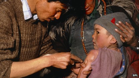 Một chuyên gia của WHO giám sát chiến dịch kiểm tra chất lượng của vắc-xin trước khi tiêm cho một đứa trẻ.  |  |