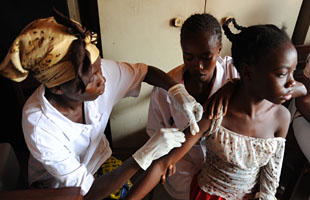 Một nhóm các nhân viên tiêm chủng từ Hội Chữ thập đỏ quốc tế cùng với các nhân viên y tế quốc gia và WHO tiếp cận càng nhiều trẻ em càng tốt trong chiến dịch.