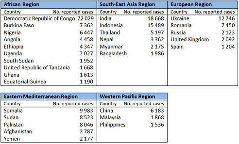 Các vụ dịch sởi lớn vào năm 2012 theo khu vực của WHO