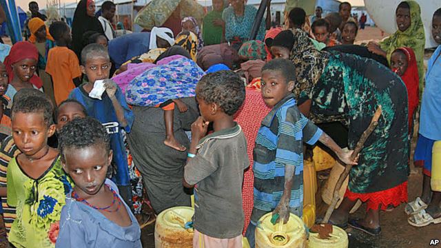 | Phụ nữ và trẻ em tụ tập xung quanh các vòi nước công cộng ở cơ sở quá cảnh tị nạn Dollo Ado ở Ethiopia, 26/10/2011 ( VOA-P. Heinlein )