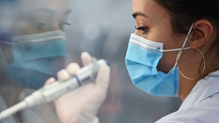Một kỹ thuật viên phòng thí nghiệm sử dụng thiết bị pipet để xử lý mẫu thử nghiệm vi rút corona COVID-19,