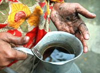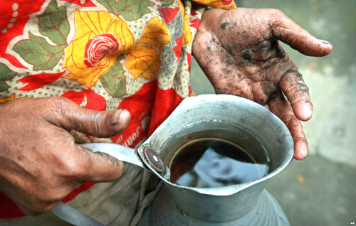 Hanufa Bibi, 45 tuổi cầm một ca nước giếng bị ô nhiễm tại ngôi làng của cô ở Chandipur, khoảng 120 km (75 dặm) về phía đông của Dhaka, |
