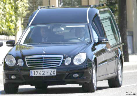 Xe tang chở quan tài của linh mục Tây Ban Nha Miguel Pajares, 75 tuổi,người châu Âu đầu tiên bị nhiễm virus Ebola, Bệnh viện Carlos III ở Madrid, Tây Ban Nha, ngày 12/8/2014. |