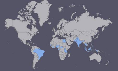 Bản đồ phân bố virus Zika ở một số quốc gia trên trên thế giới (có màu xanh)
