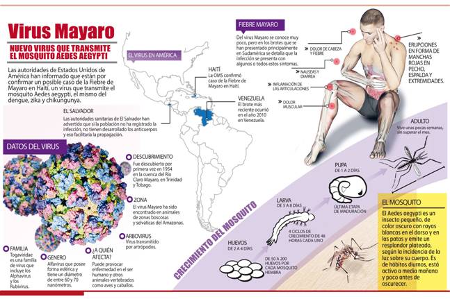 Virus Mayaro chủ yếu lây truyền qua muỗi Hamagogus nhưng muỗi Aedes aegypti, loài muỗi truyền virus Zika, cũng có thể là vật chủ mang virus này. Virus Mayaro được phát hiện đầu tiên ở Trinidad vào năm 1954. Sau đó, nó đã lan tới Guinea thuộc Pháp, Venezuela, Peru, Bolivia và Brazil thuộc châu Mỹ. Hiện thông tin về virus Mayaro rất ít nhưng gần đây, bệnh bất ngờ xuất hiện tại Haiti do sự xuống cấp của cơ sở y tế vốn đã thiếu thốn của nước này bởi trận động đất năm 2010. Điều này cho thấy những bệnh mới nổi có xu hướng phát triển ở những nơi có chiến tranh xảy ra, vệ sinh kém, nghèo đói và thiếu thốn.